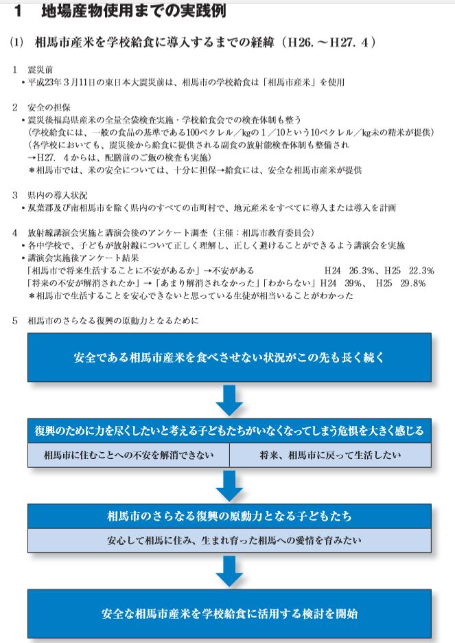 その後にやはり給食教育で福島県人として の意識を高めさせる目的のもと地産地消を進めてゆくこと、